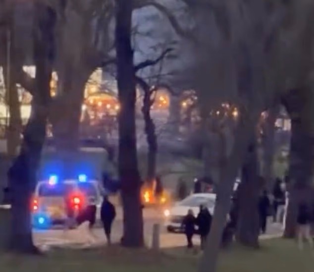 Additional footage showed massive gatherings of young people wearing balaclavas outside a nearby McDonald’s restaurant while both marked and unmarked police vehicles hurried to the situation.